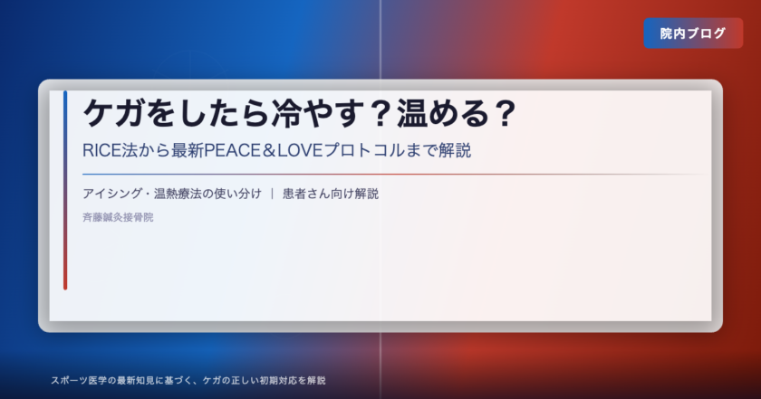 ケガをした直後、「冷やせばいい?温めればいい?」と迷ったことはありませんか?昔から「ケガは冷やす」と言われてきましたが、近年スポーツ医学の世界では新しい考え方が広まっています。 今回は、長年使われてきた「RICE法」と、それを発展させた最新の「PEACE & LOVE」プロトコルをわかりやすく解説し、ケガの段階に応じた正しい対処法をお伝えします。